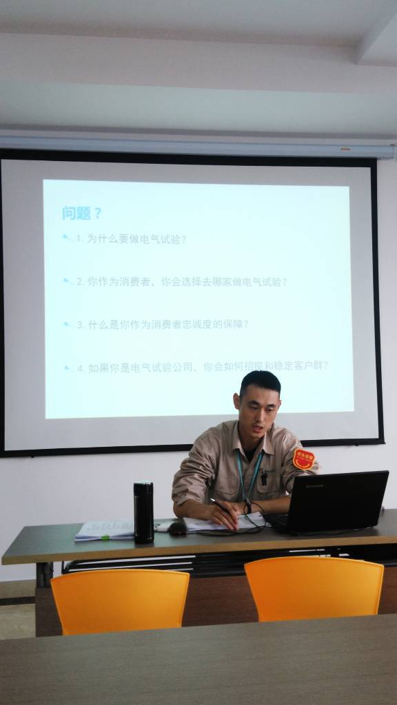 電試班組是公司重要的組成部門,是鑒定安裝工程安全性和正確性的最后把關(guān)部門,培訓(xùn)過(guò)程中分析了電氣試驗(yàn)的重要性,就安全生產(chǎn)聯(lián)系客戶市場(chǎng)提出了系列發(fā)人深思的現(xiàn)實(shí)性問(wèn)題,灌輸全體電試班組工作人員思想上重視安全、工作中遵規(guī)守紀(jì)、實(shí)操時(shí)循序漸進(jìn)、強(qiáng)化自身安全責(zé)任感的重要理念,培訓(xùn)中由電試班組領(lǐng)導(dǎo)程英就近期工作開(kāi)展情況和電試業(yè)務(wù)的操作規(guī)范要求作了報(bào)告。